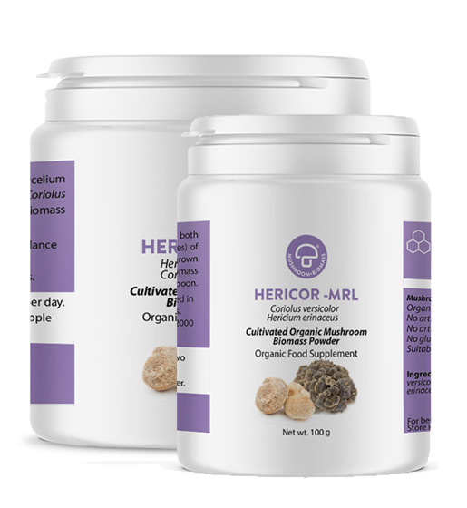 Hericor-MRL Ltd.'s powder contains Coriolus versicolor 50% and Hericium erinaceus 50%, cultivated into biomass grown on sterilised (autoclaved) substrates.